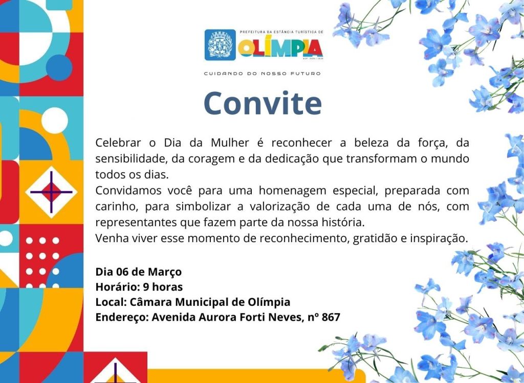 A Secretaria Municipal de Educação da Estância Turística de Olímpia realiza nesta quinta-feira, 6 de março, às 9h, uma cerimônia de homenagem a cinco mulheres que contribuíram para a história e o desenvolvimento do município. O evento ocorrerá na Câmara Municipal e integra as ações alusivas ao Dia Internacional da Mulher, 8 de março.