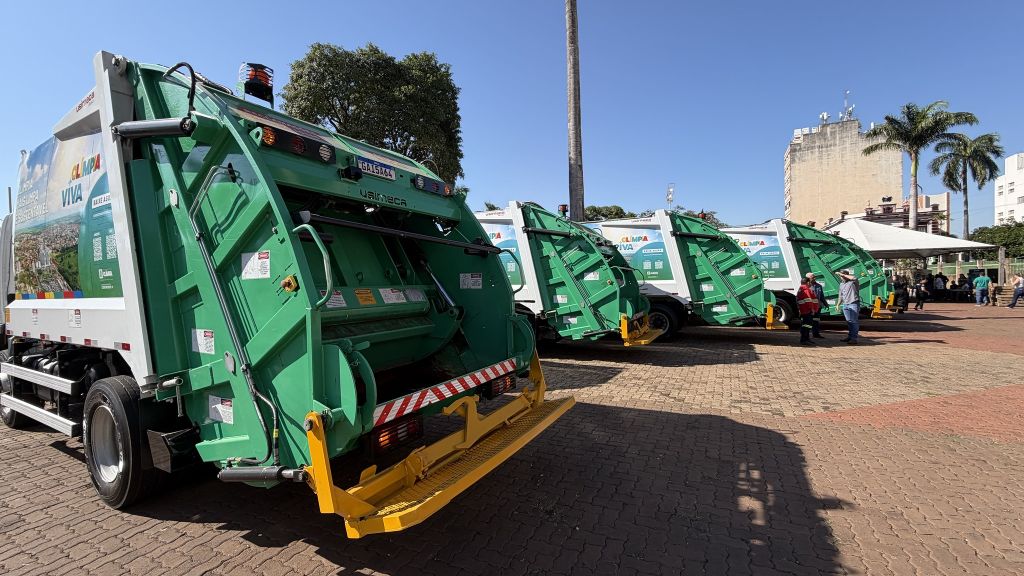 Foram exibidos caminhões de coleta, veículos operacionais e equipamentos destinados à varrição, transporte de resíduos, ecopontos, trituração de galhos e apoio à limpeza pública.