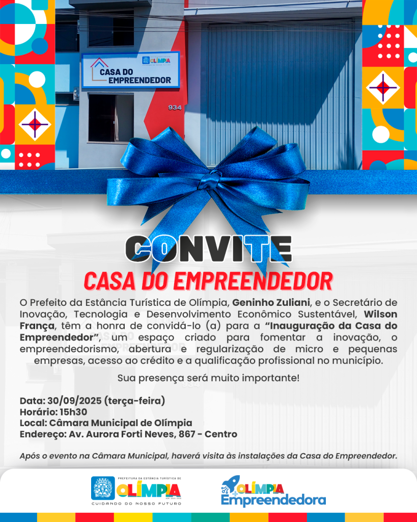 A Estância Turística de Olímpia inaugura nesta terça-feira, 30 de setembro, a Casa do Empreendedor. A cerimônia terá início às 15h30, na Câmara Municipal, e marcará a entrega de um espaço voltado ao fortalecimento do desenvolvimento econômico, incentivo à inovação e apoio a novos negócios.
