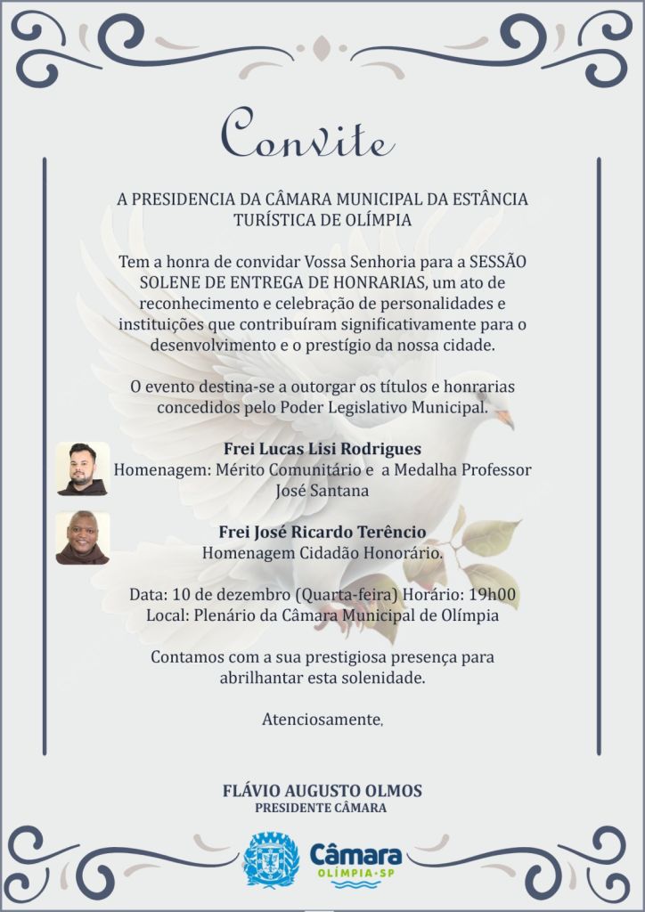 A Câmara Municipal de Olímpia realizará no próximo dia 10, às 19h, uma sessão solene para homenagear dois religiosos que marcaram sua atuação no Santuário Nossa Senhora Aparecida ao longo dos últimos anos. O ato reconhecerá o trabalho de Frei Lucas Lisi Rodrigues, OFM, Reitor e Guardião do Santuário e Vigário Custodial da Custódia do Sagrado Coração de Jesus, que está há seis anos em Olímpia, e de Frei José Ricardo Terêncio, que será agraciado com o Título de Cidadão Honorário, de iniciativa do presidente Flávio Augusto Olmos.