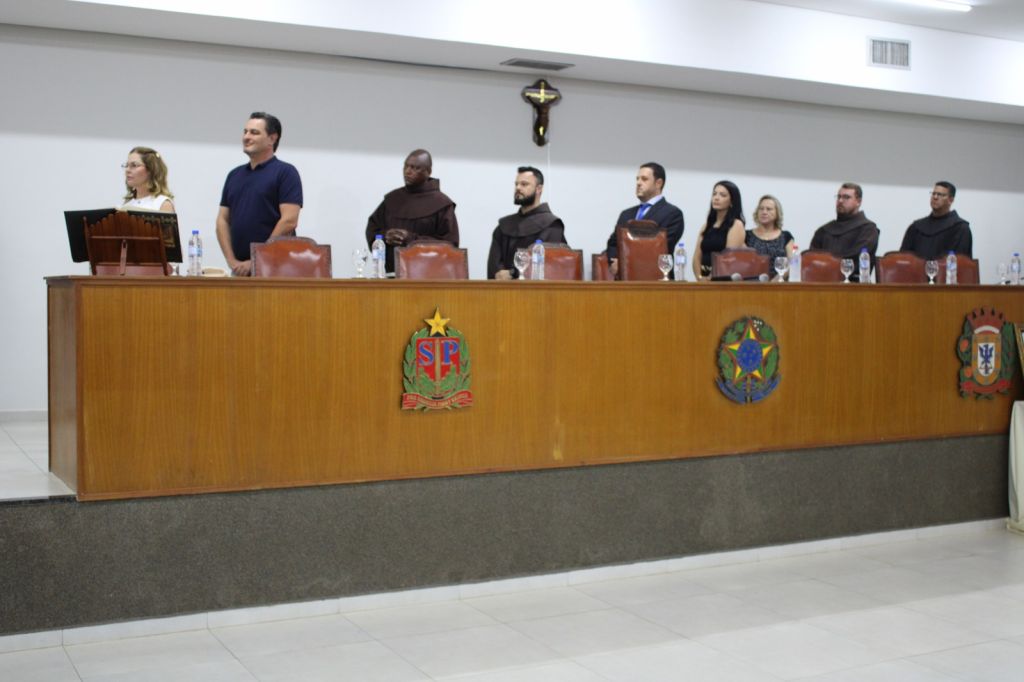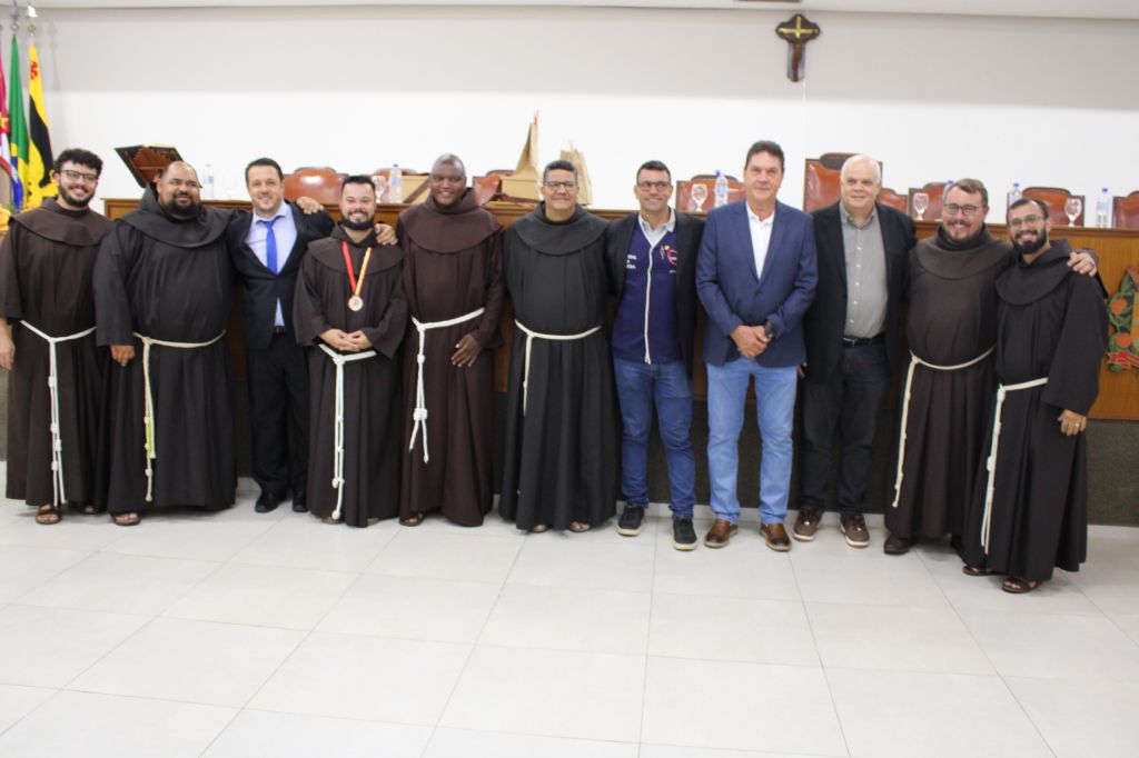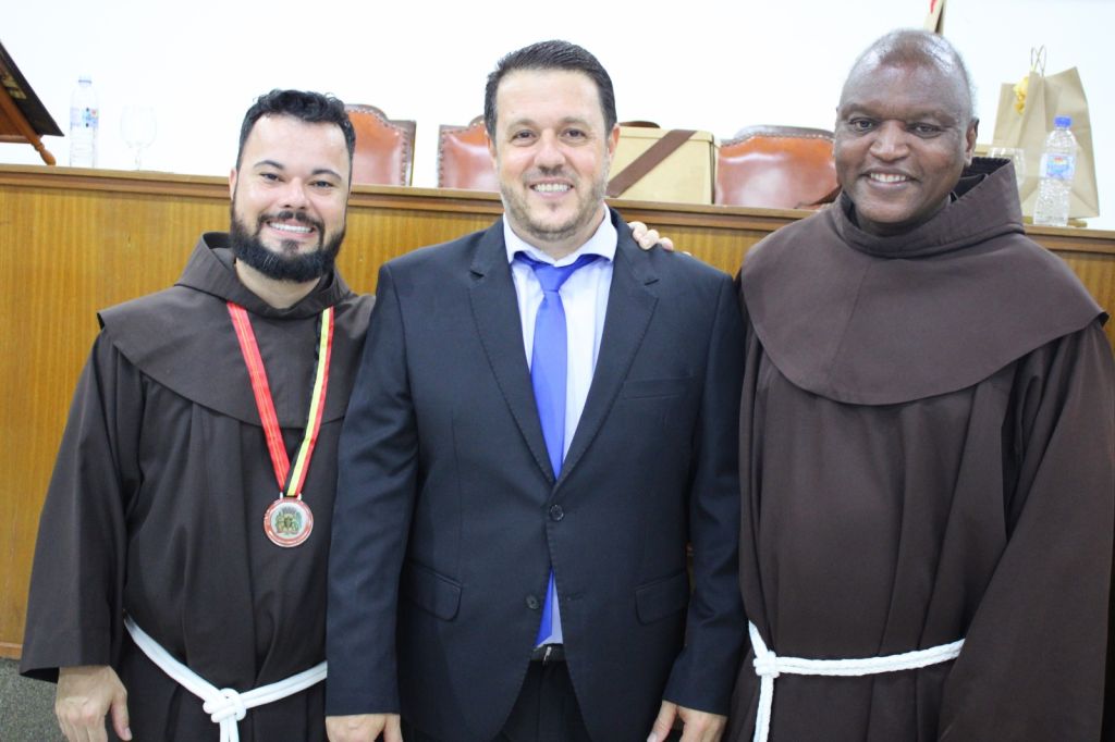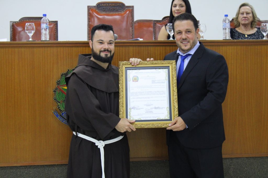 A Câmara Municipal da Estância Turística de Olímpia realizou, na noite desta quarta-feira (10), sessão solene para homenagear dois religiosos da Ordem dos Frades Menores que atuam no Santuário Nossa Senhora Aparecida. O plenário recebeu autoridades, membros da fraternidade franciscana e representantes de grupos pastorais para acompanhar a entrega do Mérito Comunitário e da Medalha Professor José Sant’Anna a Frei Lucas Lisi Rodrigues, e do título de cidadão honorário ao Frei José Ricardo Terêncio.