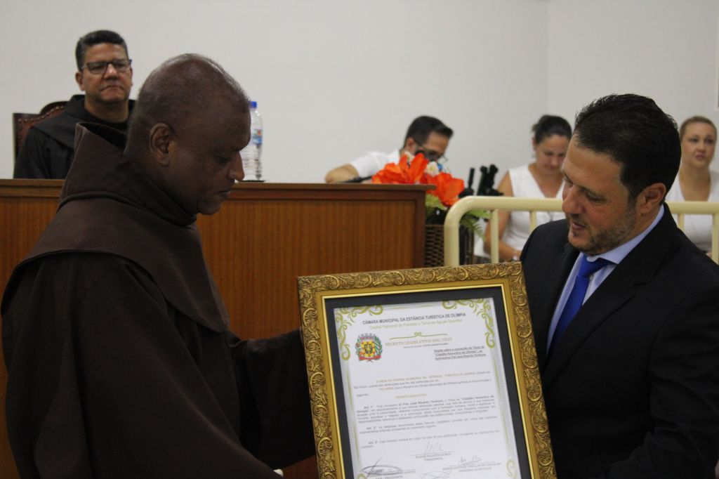 A entrega do título a Frei José Ricardo incluiu atos conduzidos pelo presidente Flávio Olmos e pelo prefeito Geninho Zuliani. A cerimônia de “lava-mãos” simbolizou acolhimento. O sacerdote também recebeu toalha em linho, terra do município em frasco com trançado estrela — arte típica local — e a bandeira de Olímpia. O decreto legislativo nº 696/2025 foi lido pelo cerimonialista Rogério.