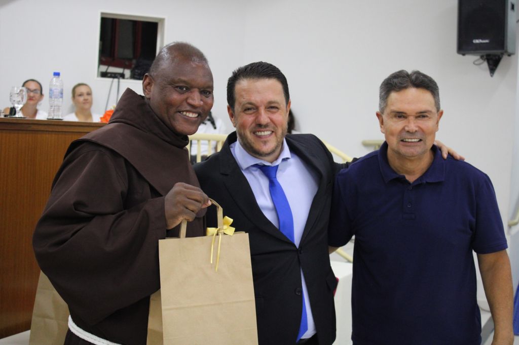 O presidente da Câmara também dirigiu homenagem ao Frei Eduardo Augusto Schiel, que assumirá nova etapa pastoral no santuário. Um presente foi entregue por Ana Laura Olmos.