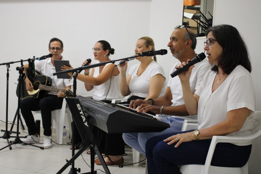 O coral do Santuário Nossa Senhora Aparecida, formado por Donizete, Tatiana, Adilson, Zeza e Natália, apresentou o Hino do Santuário.