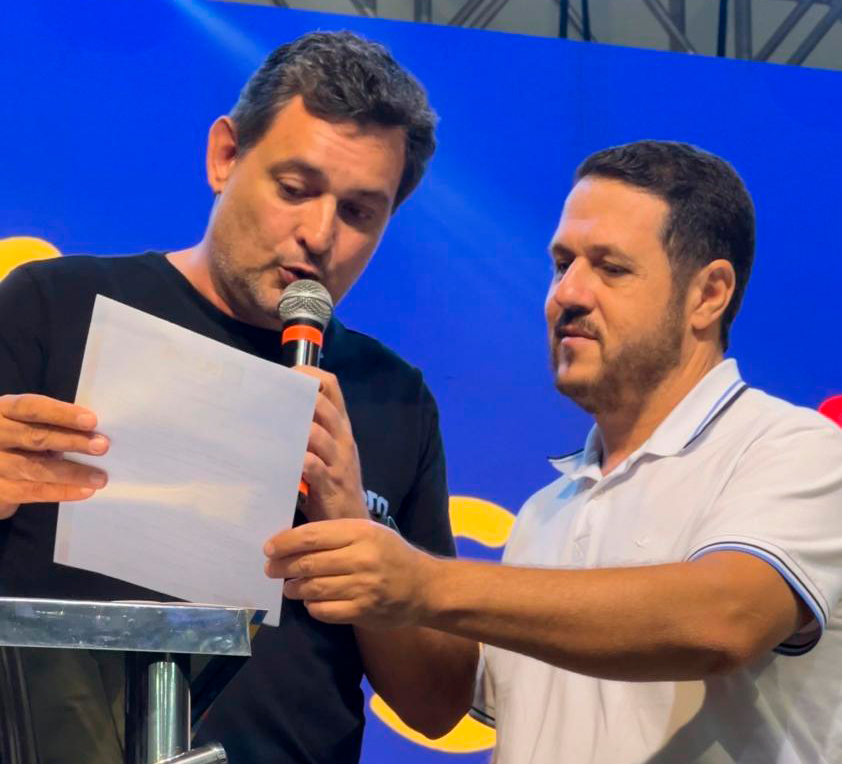 Prefeito Geninho entrega ao presidente da Câmara Flávio Olmos na abertura do Ano Letivo